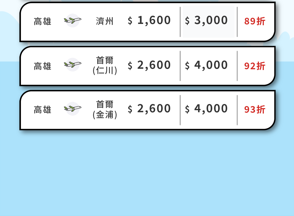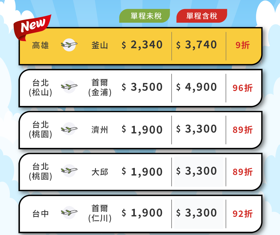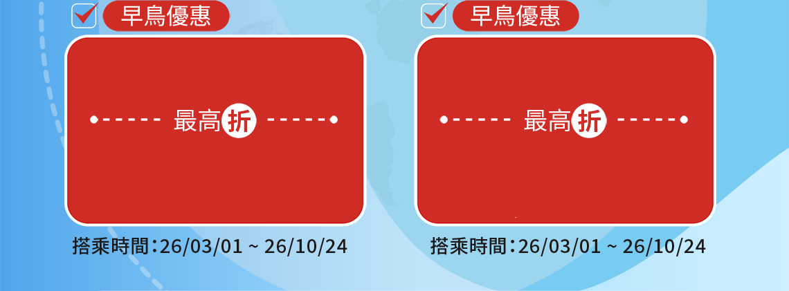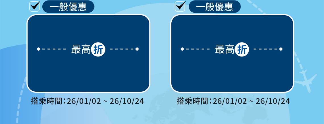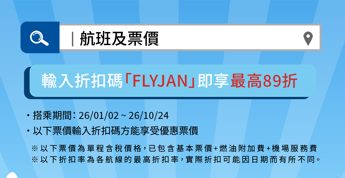 - 根據營業政策,各航線搭乘的期間中,可能會有不適用該特價票價的日期,敬請見諒。