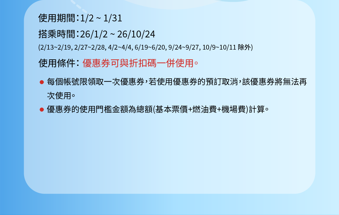 - 取消使用優惠券結算的預訂時,優惠券無法恢復。(機票/行李優惠券均適用)