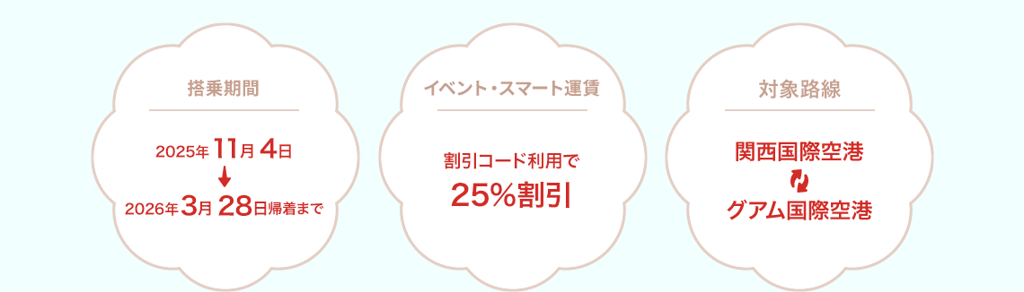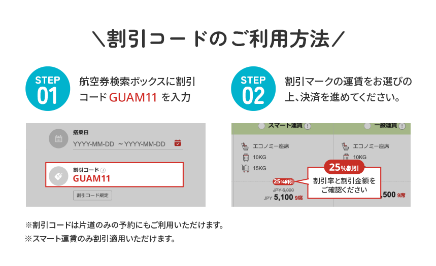 - 営業ポリシーにより、路線別の搭乗期間中に該当割引コードが適用されない日付も発生することがありますので、ご了承ください。