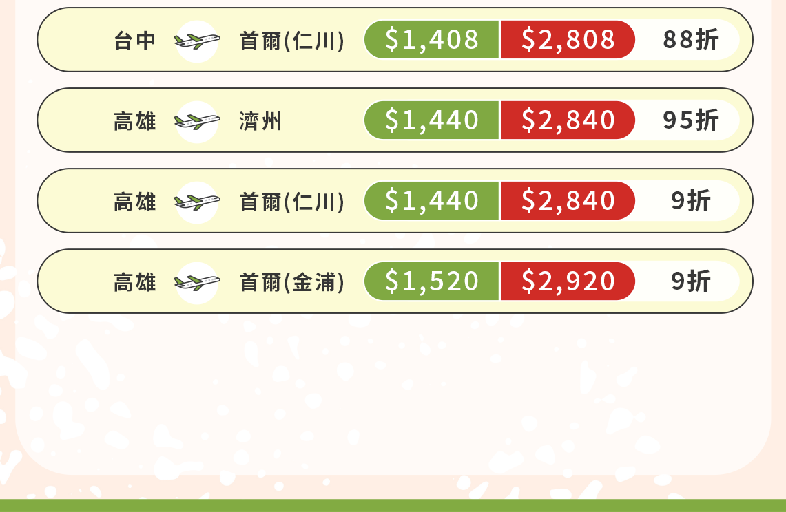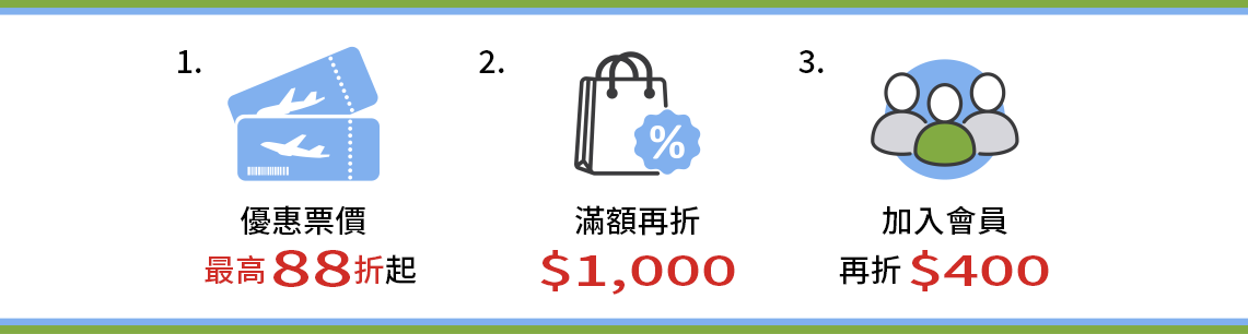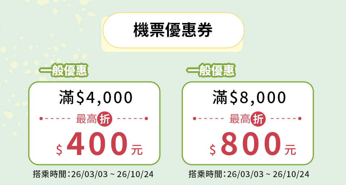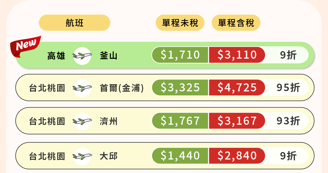 - 根據營業政策,各航線搭乘的期間中,可能會有不適用該特價票價的日期,敬請見諒。
