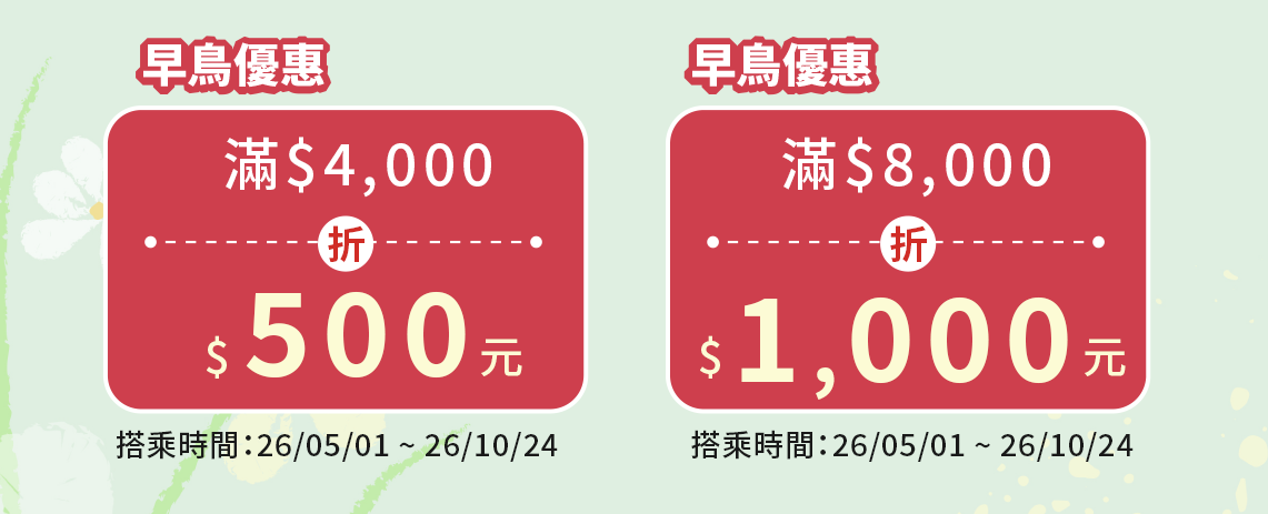 - 根據營業政策,各路線搭乘的期間可能會有無法使用該優惠的日期,敬請見諒。