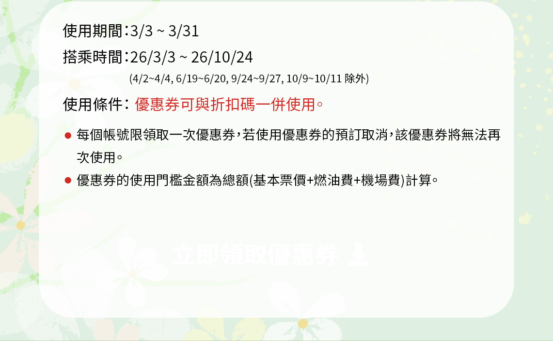- 取消使用優惠券結算的預訂時,優惠券無法恢復。(機票/行李優惠券均適用)