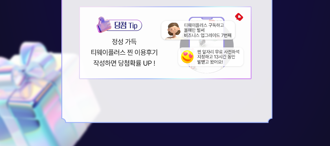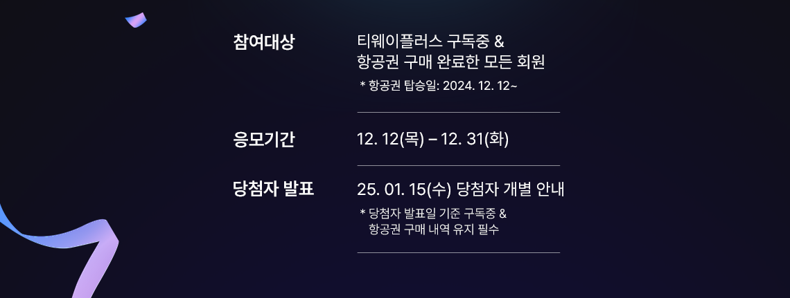 - 참여대상 : 티웨이플러스 구독중 & 항공권 구매 완료한 모든 회원 (*항공권 탑승일: 2024.12.12~)