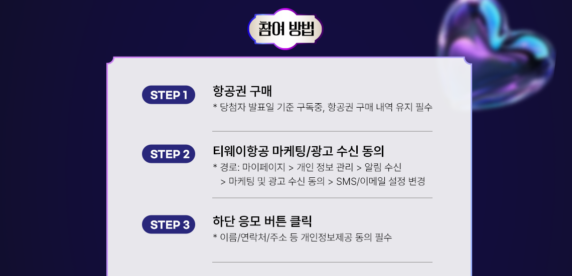 - STEP2 : 티웨이항공 마케팅/광고 수신 동의 (*경로:마이페이지 > 개인 정보 관리 > 알림 수신 > 마케팅 및 광고 수신 동의 > SMS/이메일 설정 변경)