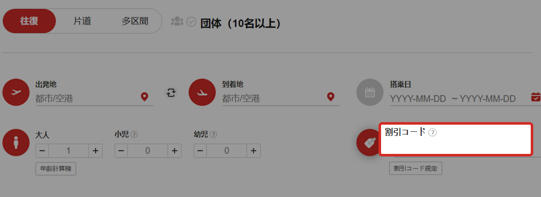 - 営業ポリシーにより、路線別の搭乗期間中に該当割引コードが適用されない日付も発生することがありますので、ご了承ください。