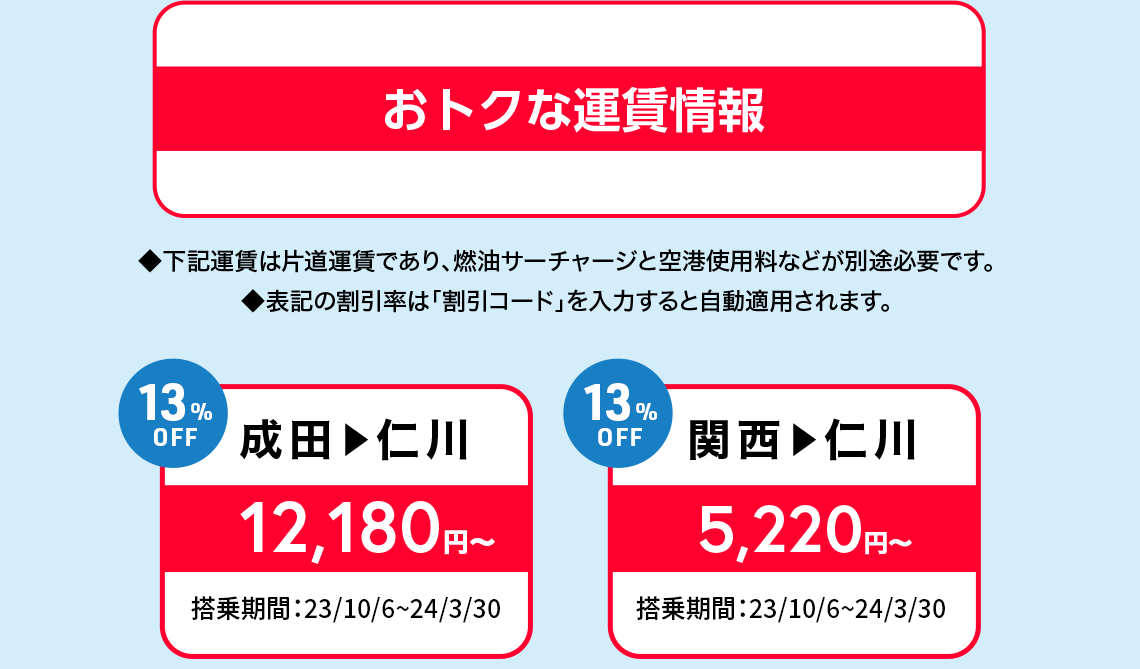 ◆下記運賃は片道運賃であり、燃油サーチャージと空港使用料などが別途必要です。 ◆表記の割引率は「割引コード」を入力すると自動適用されます。-