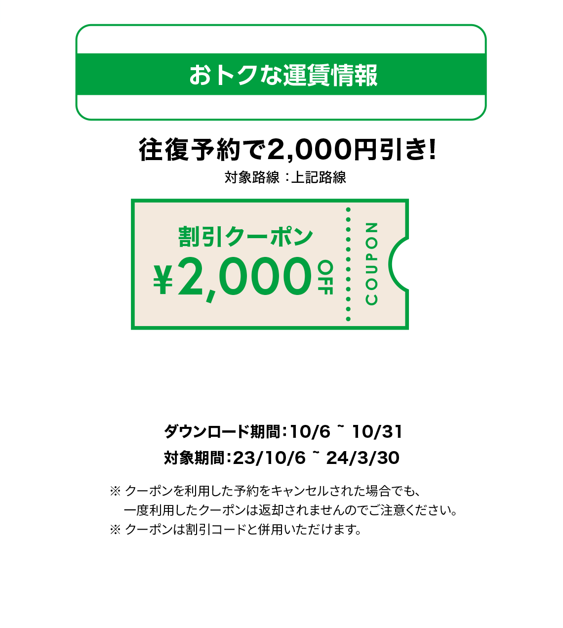 往復予約で2,000円引き! 対象路線 :上記路線- 割引クーポン