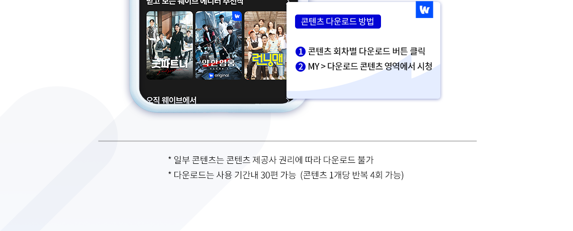 - 자세한 사항은 웨이브 홈페이지 하단 이용약관 메뉴 내 ‘유료 상품 이용약관’을 참조하시기를 바랍니다.