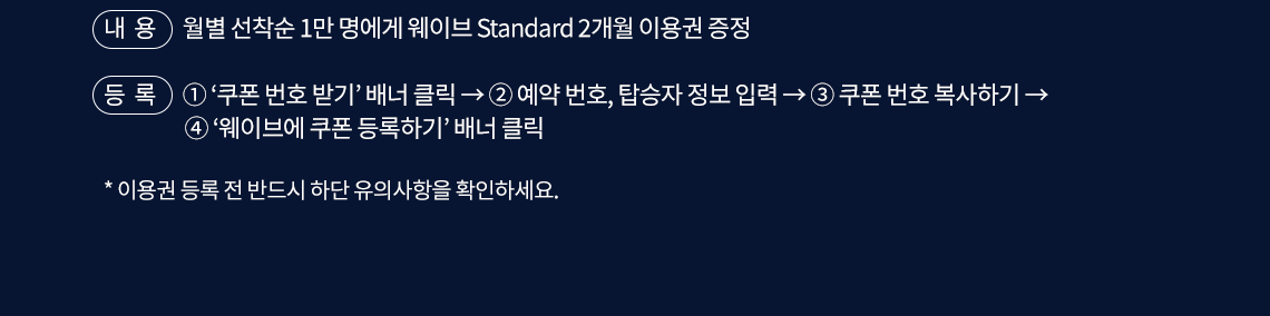 - 등록:①'쿠폰 번호 받기'배너 클릭 → ②예약 번호, 탑승자 정보 입력 → ③쿠폰 번호 복사하기 → ④'웨이브에 쿠폰 등록하기'배너 클릭