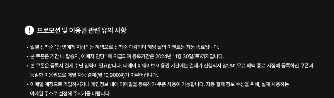 - 본 쿠폰은 등록시 결제 수단 입력이 필요합니다. 티웨이 X 웨이브 이용권 기간에는 결제가 진행되지 않으며, 무료 혜택 종료 시점에 등록하신 쿠폰과 동일한 이용권으로 매월 자동 결제(월 10,900원)가 이루어집니다.