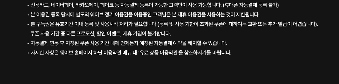 - 본 이용권 등록 당시에 별도의 웨이브 정기 이용권을 이용중인 고객님은 본 제휴 이용권을 사용하는 것이 제한됩니다. (기존 이용 이력이 있으나, 현재 구독 상태가 아닌 고객님께서는 본 이용권을 사용하실 수 있습니다.)