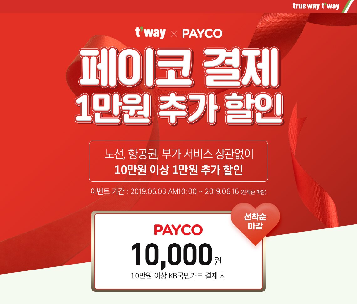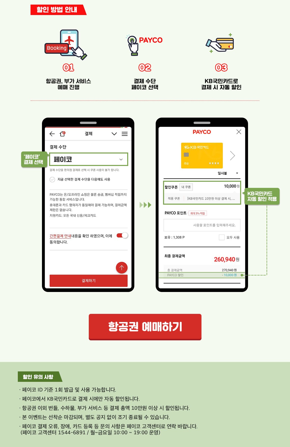 할인 방법 : 항공권,부가서비스 예매 진행 -> 결제수단 페이코 선택 -> KB국민카드로 결제 시 자동 할인