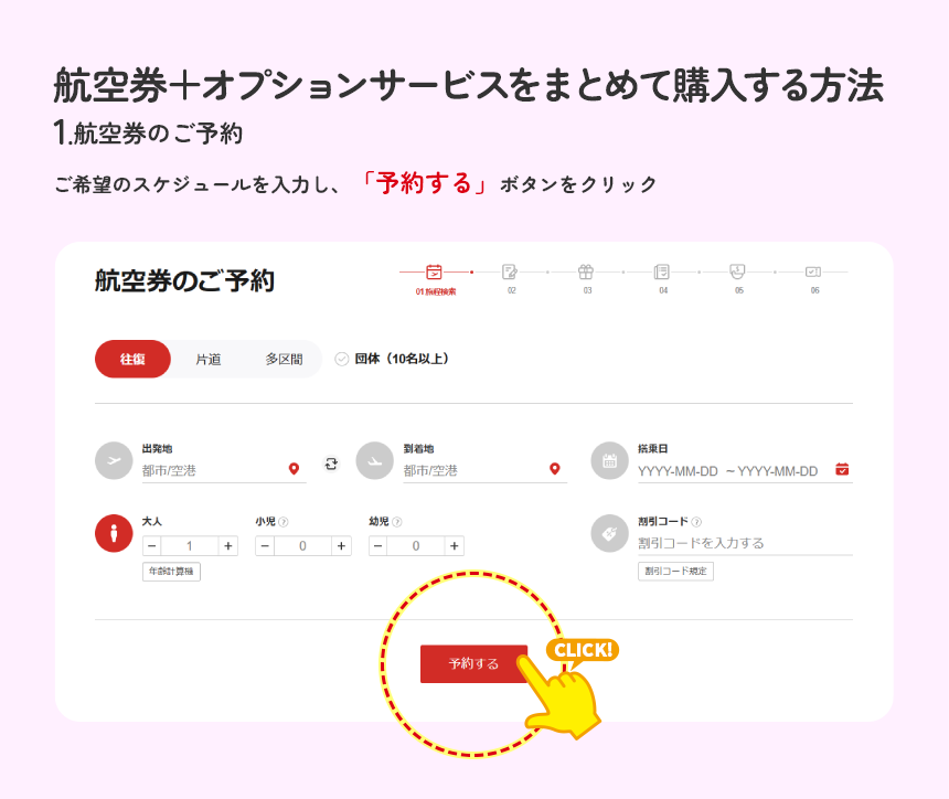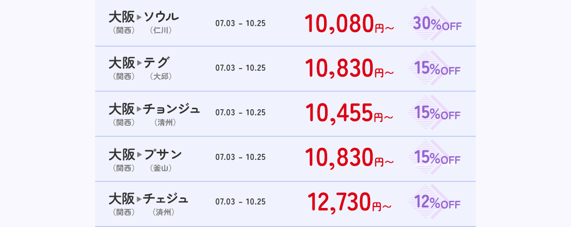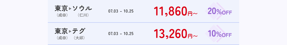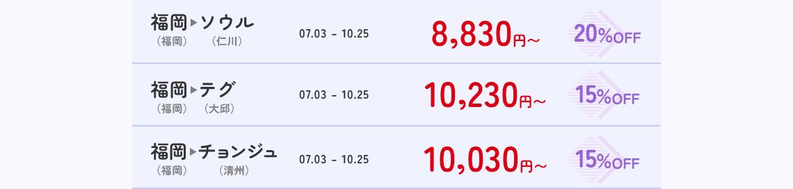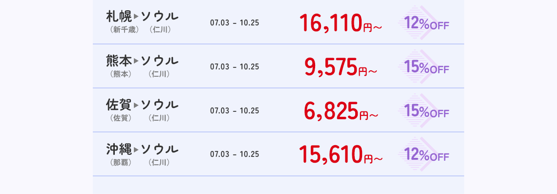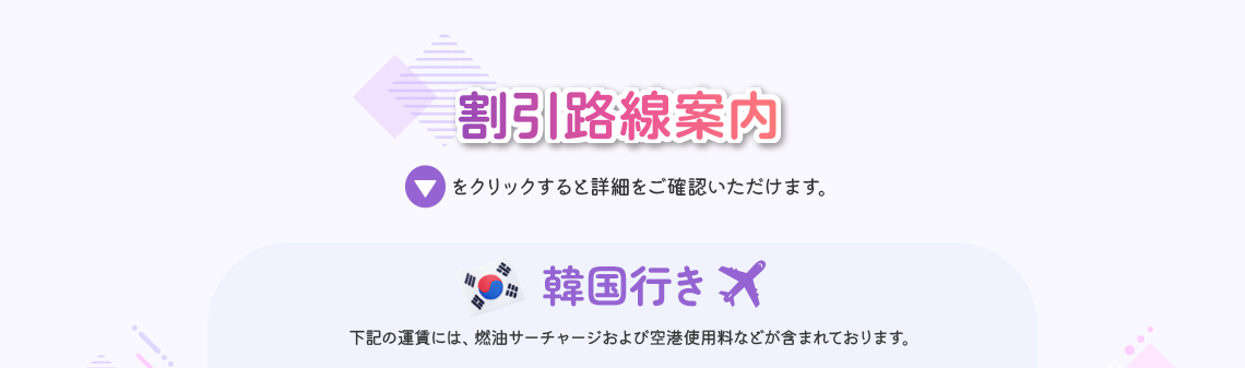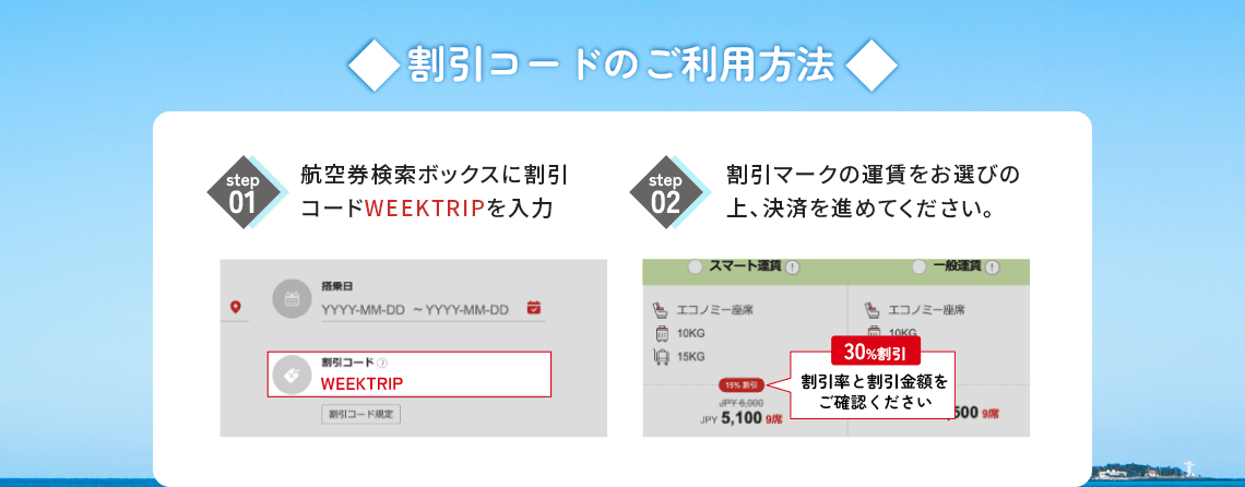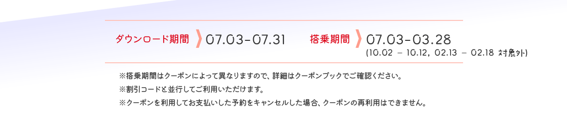 - 営業ポリシーにより、路線別の搭乗期間中に該当割引コードが適用されない日付も発生することがありますので、ご了承ください。