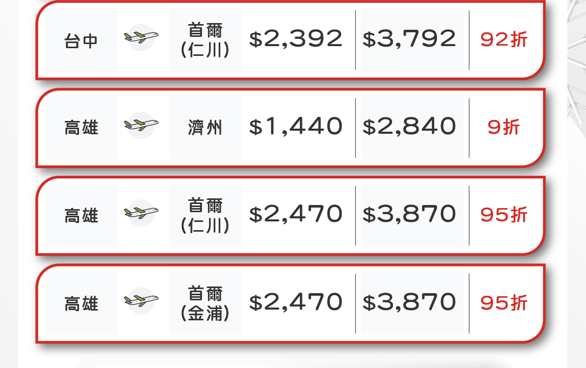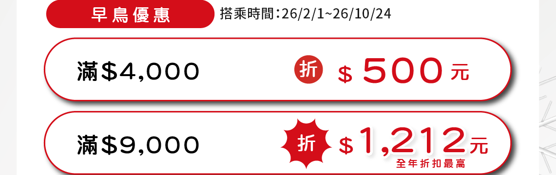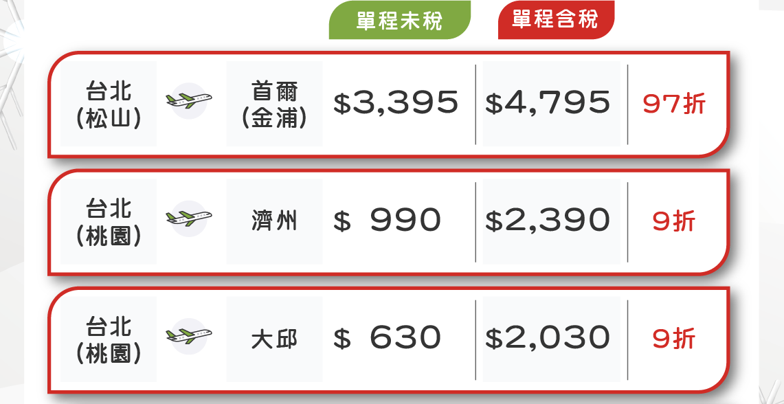 - 根據營業政策,各航線搭乘的期間中,可能會有不適用該特價票價的日期,敬請見諒。