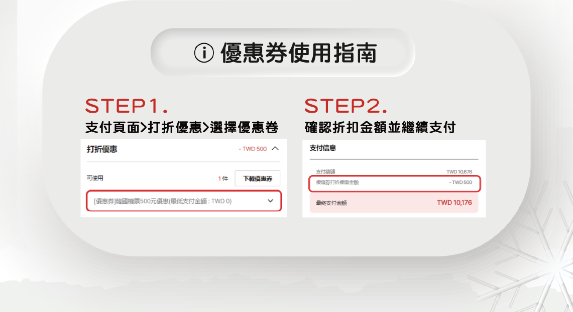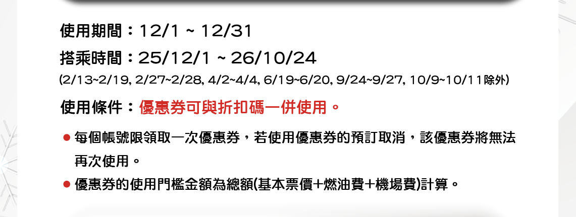 - 取消使用優惠券結算的預訂時,優惠券無法恢復。(機票/行李優惠券均適用)