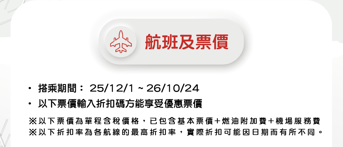 - 特價機票首次開放的時間是2025年12月1日上午9點,依先後順序限量銷售。
