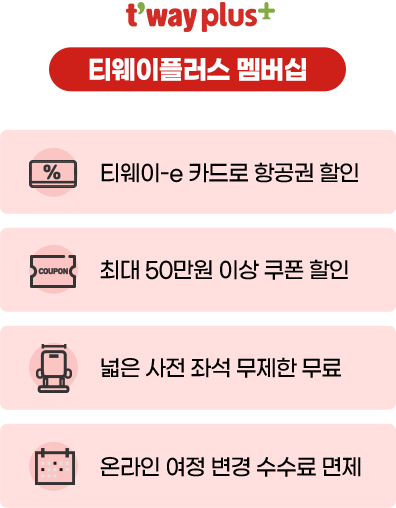 * 멤버십 혜택 범위는 등급에 따라 상이하오니, 티웨이플러스 멤버십 홈페이지에서 상세 혜택을 확인하시기 바랍니다.