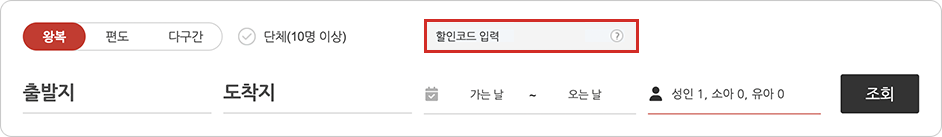 - · 할인 코드는 편도/왕복 예매 시 모두 사용할 수 있습니다.