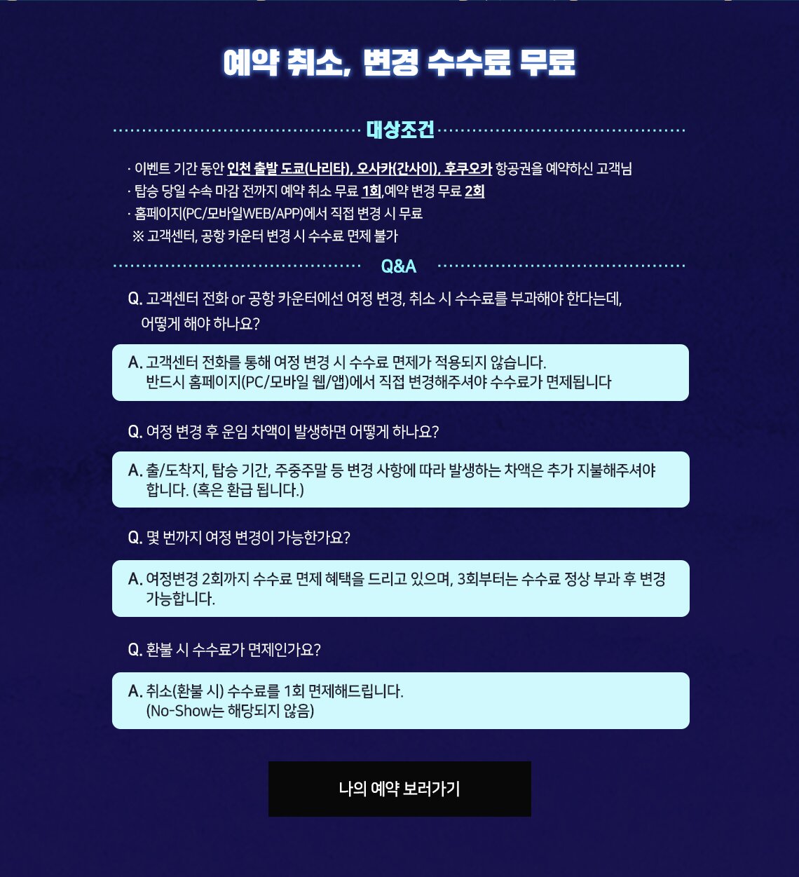 - 항공권 환불 및 여정 변경 시 수수료가 발생할 수 있으니 항공권 구매 시 예약 변경 및 환불 안내를 반드시 확인하시기 바랍니다.