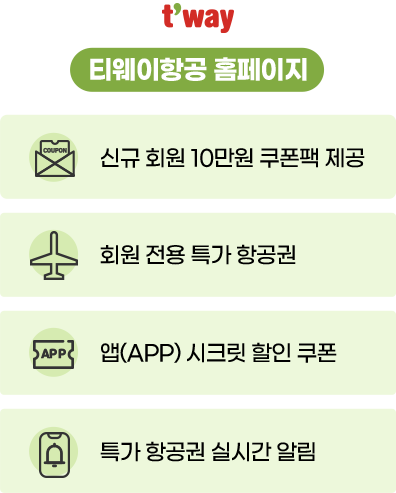 - 당사 홈페이지, 모바일 웹(m.twayair.com), 모바일 앱을 통해서만 예매 가능합니다.