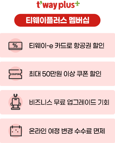 티웨이 e-카드로 항공권 할인 최대 50만원 이상 쿠폰 할인 비즈니스 무료 업그레이드 기회 온라인 여정 변경 수수료 면제