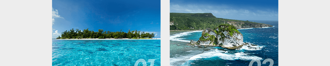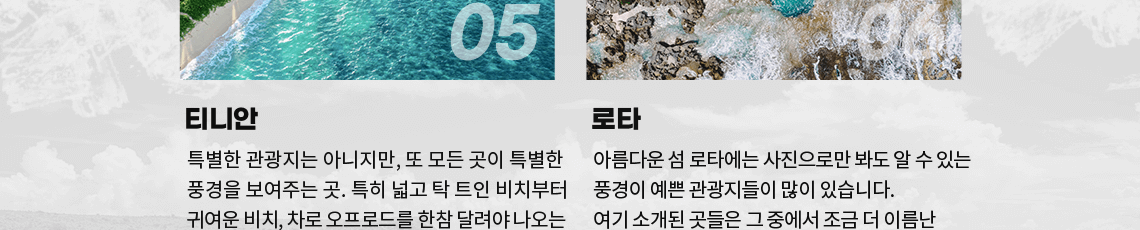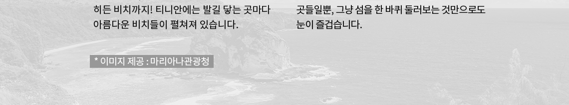 - 티니안 (Tinian) : 특별한 관광지는 아니지만, 또 모든 곳이 특별한 풍경을 보여주는 곳. 특히 넓고 탁 트인 비치부터 귀여운 비치, 차로 오프로드를 한참 달려야 나오는 이든 비치까지! 티니안에는 발길 닿는 곳마다 아름다운 비치들이 펼쳐져 있습니다.