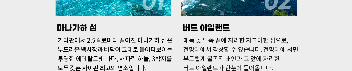 - 마나가하 섬(Managaha Island) : 가라판에서 2.5킬로미터 떨어진 마나가하 섬은 부드러운 백사장과 바닥이 그대로 들여다보이는 투명한 에메랄드빛 바다, 새파란 하늘 3박자를 모두 갖춘 사이판 최고의 명소입니다.