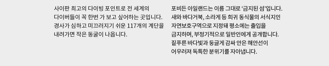 - 포비든 아일랜드(Forbidden Island) : 포비든 아일랜드는 이름 그대로 '금지된 섬'입니다. 새와 바다거북, 소라게 등 희귀 동식물의 서식지인 자연보호구역으로 지정돼 평소에는 출입을 금지하며 부정기적으로 일반인에게 공개합니다. 짙푸른 바다빛과 둥글게 감싸 안은 해안선이 독특한 분위기를 자아냅니다.