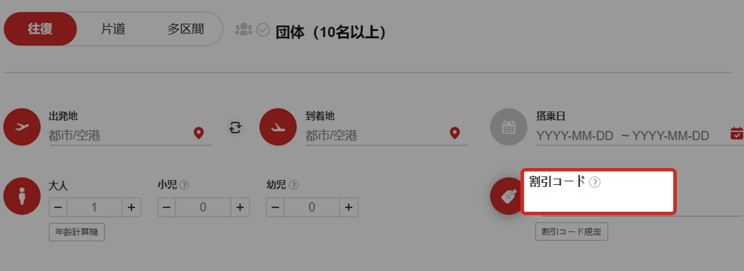 - 割引コード入力後、航空便を予約する際に 「割引コード」 バッジを必ずご確認ください。