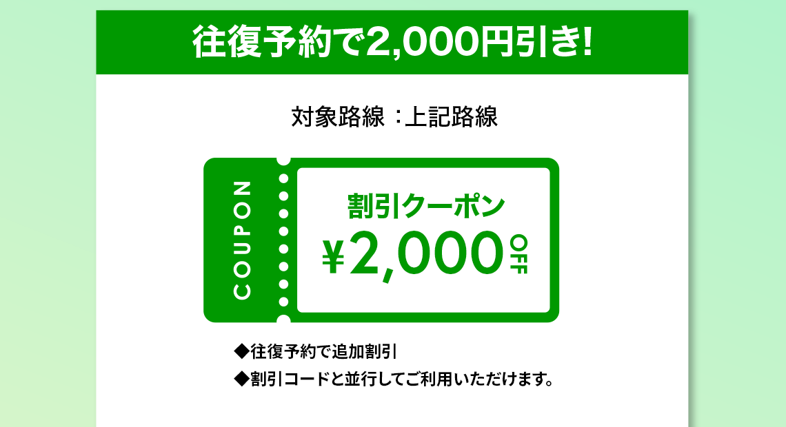 往復予約で2,000円引き! 対象路線 :上記路線- 割引クーポン