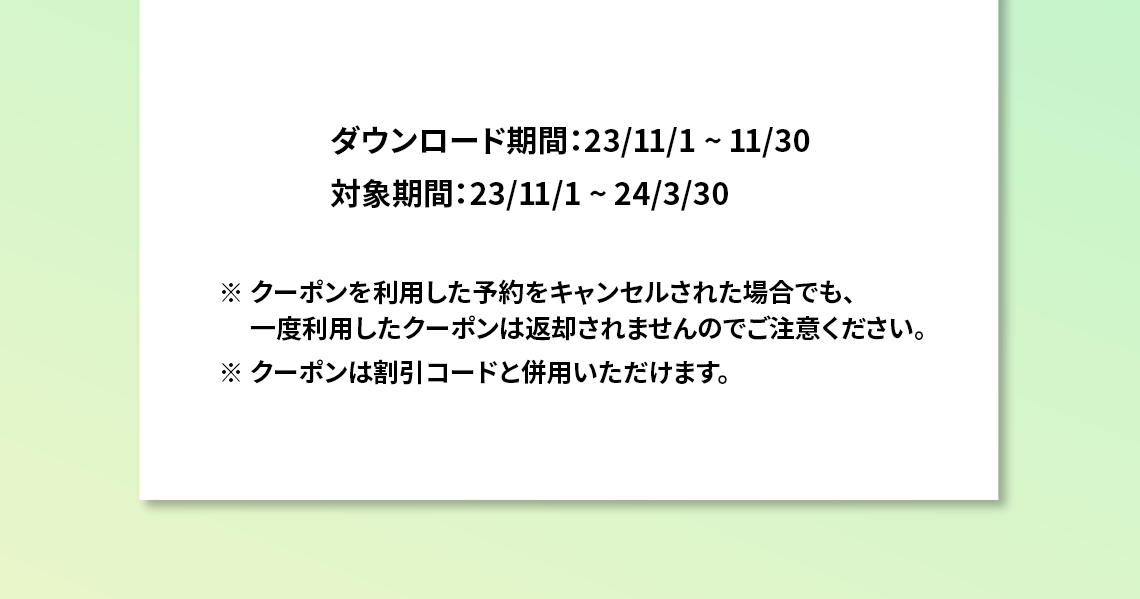 - ※ クーポンを利用した予約をキャンセルされた場合でも、一度利用したクーポンは返却されませんのでご注意ください。