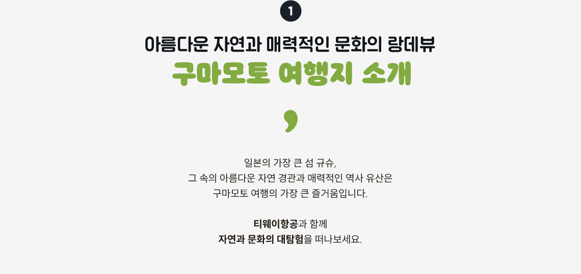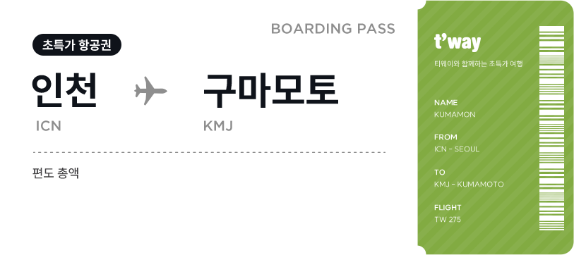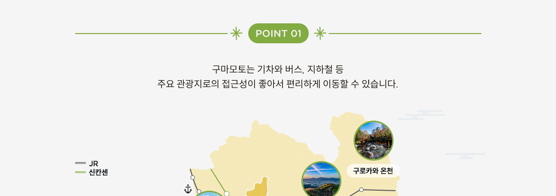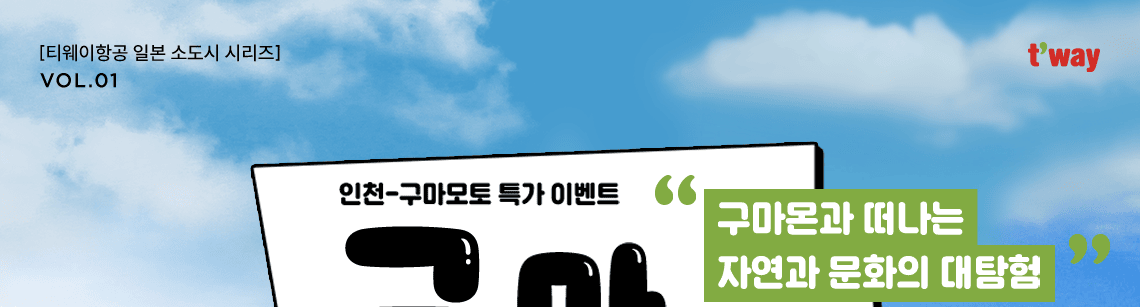 일본의 가장 큰 섬 규슈, 그 속의 아름다운 자연 경관과 매력적인 역사 유산은 구마모토 여행의 가장 큰 즐거움입니다. 티웨이항공과 함께 자연과 문화의 대탐험을 떠나보세요.POINT 01. 구마모토는 기차와 버스, 지하철 등 주요 관광지로의 접근성이 좋아서 편리하게 이동할 수 있습니다.