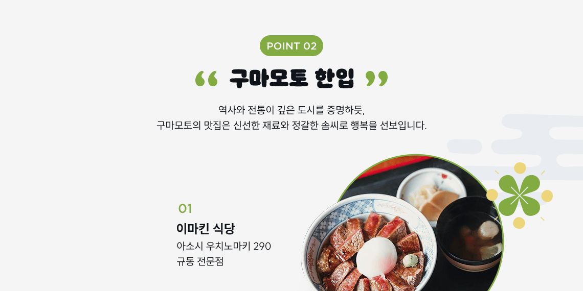 POINT 02. "구마모토 한입" 역사와 전통이 깊은 도시를 증명하듯, 구마모토의 맛집은 신선한 재료와 정갈한 솜씨로 행복을 선보입니다.