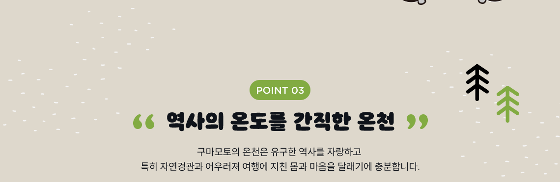 POINT 03. "역사의 온도를 간직한 온천" 구마모토의 온천은 유구한 역사를 자랑하고 특히 자연경관과 어우러져 여행에 지친 몸과 마음을 달래기에 충분합니다.
