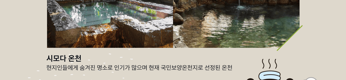 - 시모다 온천 : 현지인들에게 숨겨진 명소로 인기가 많으며 현재 국민보양온천지로 선정된 온천