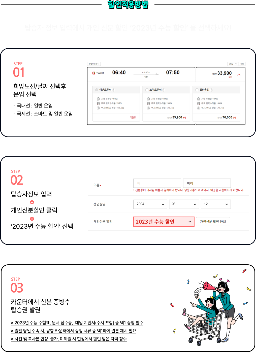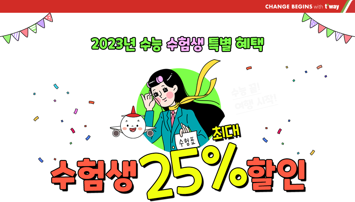 - 일부 항공편에서 수능 할인 적용 시보다 낮은 탄력적 할인 운임으로 판매되는 경우가 발생할 수 있으니 참고바랍니다.