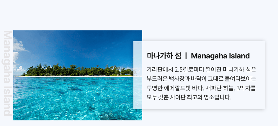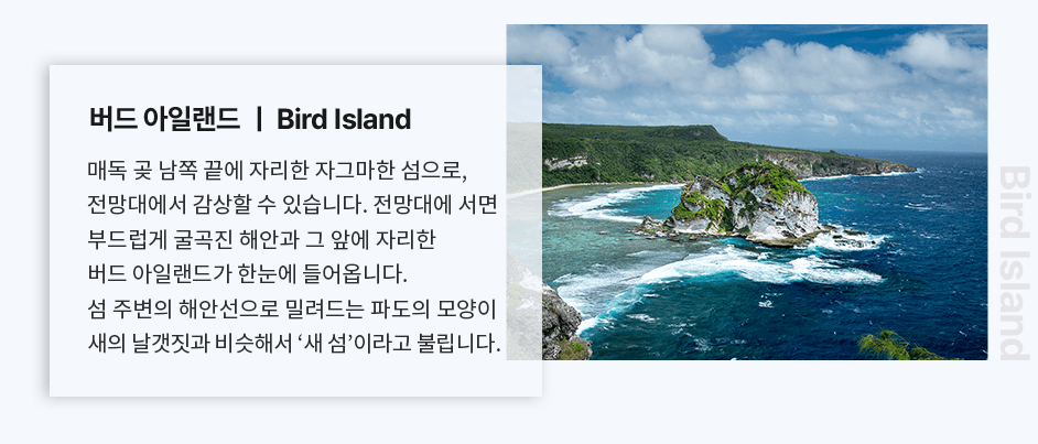 가라판에서 2.5킬로미터 떨어진 마나가하 섬은 부드러운 백사장과 바닥이 그대로 들여다보이는 투명한 에메랄드빛 바다, 새파란 하늘, 3박자를 모두 갖춘 사이판 최고의 명소입니다.버드 아일랜드 ㅣ Bird Island