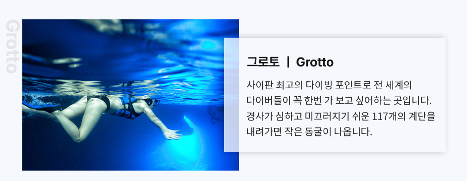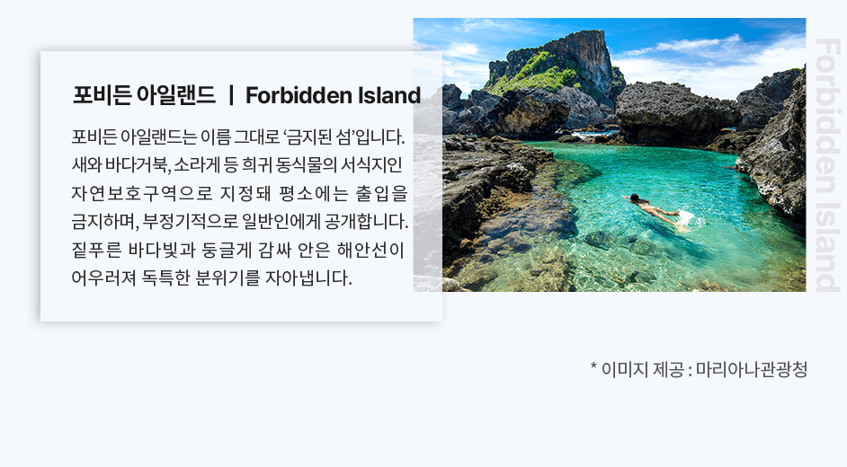 사이판 최고의 다이빙 포인트로 전 세계의 다이버들이 꼭 한번 가 보고 싶어하는 곳입니다. 경사가 심하고 미끄러지기 쉬운 117개의 계단을 내려가면 작은 동굴이 나옵니다.포비든 아일랜드 ㅣ Forbidden Island