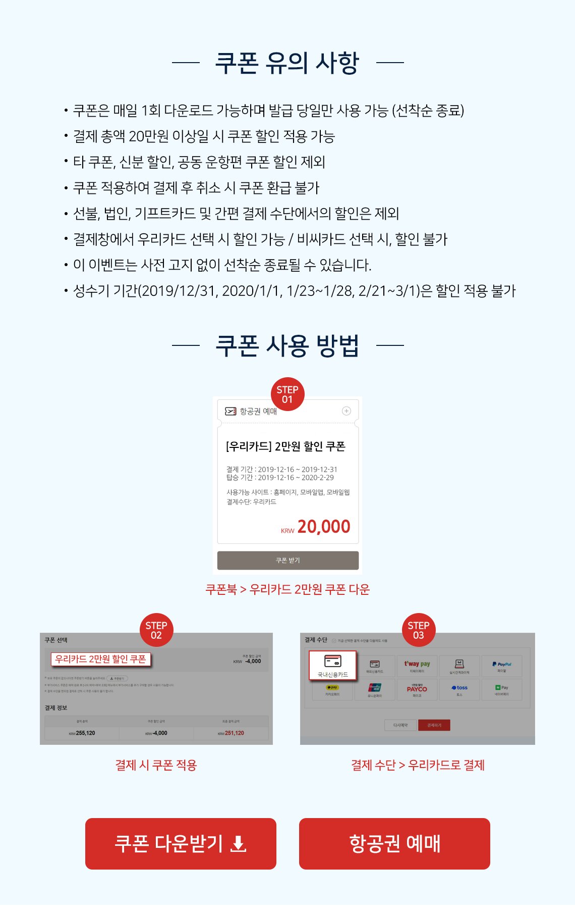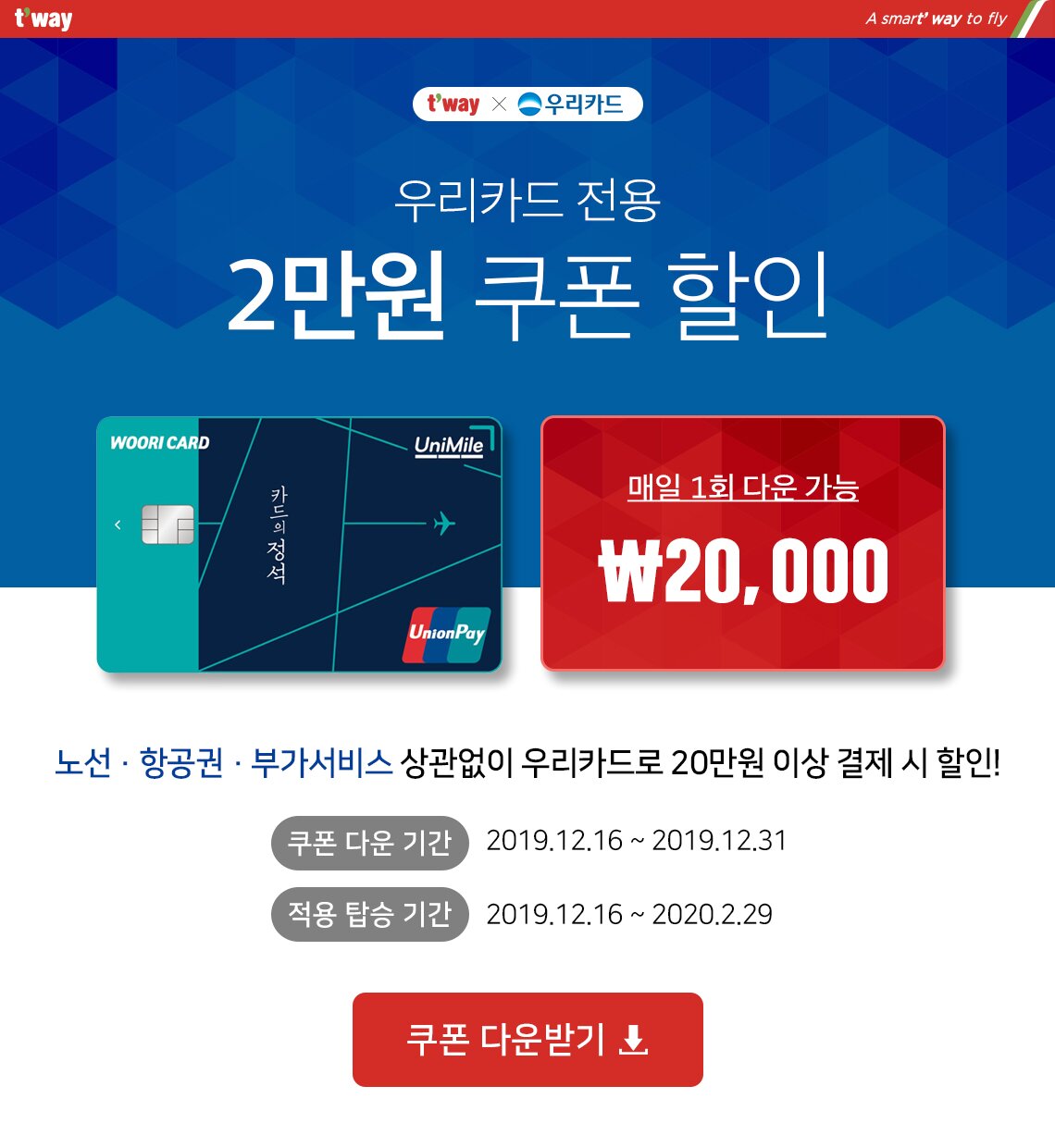 우리카드 20만원 이상 결제 시 적용 가능한 쿠폰 할인 이벤트로 이벤트 기간은 오는 12월 16일부터 31일까지이며 적용 탑승 기간은 오눈 12월 16일부터 2020년 2월 29일까지(성수기 제외)입니다.