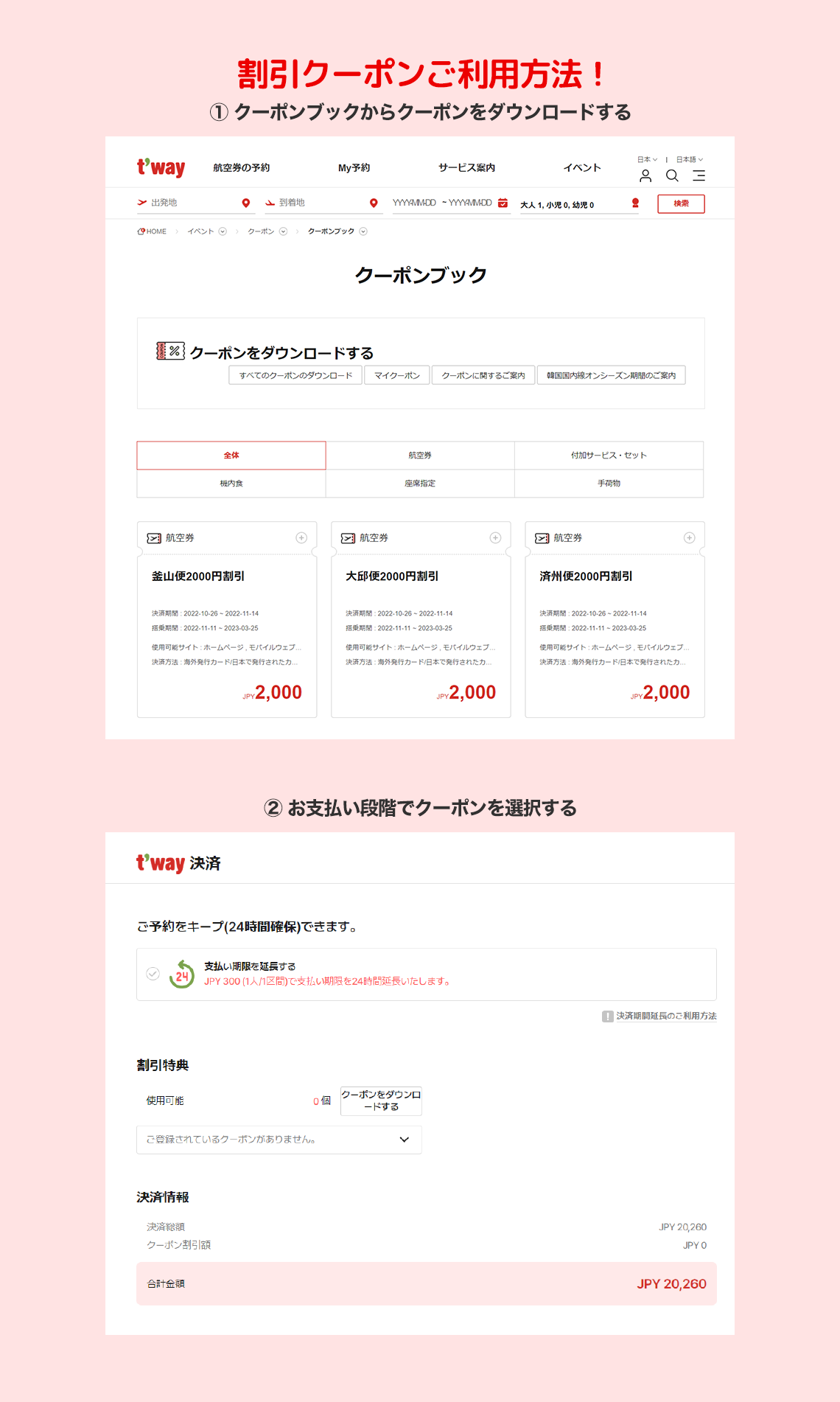 運賃規定を必ずご確認ください。 - 本クーポンは当社ホームページ、モバイルアプリ(m.twayair.com)を通してのみ予約可能です。