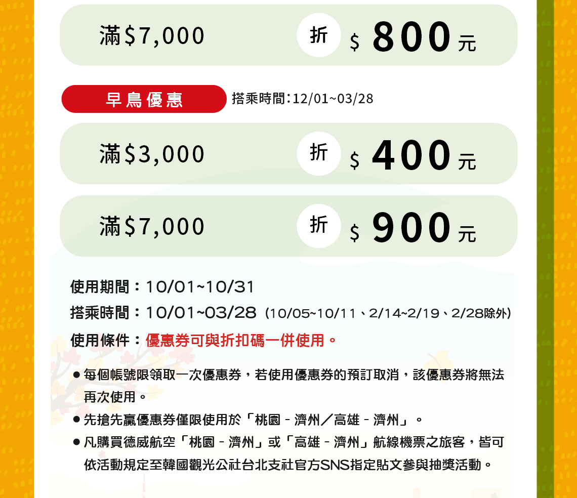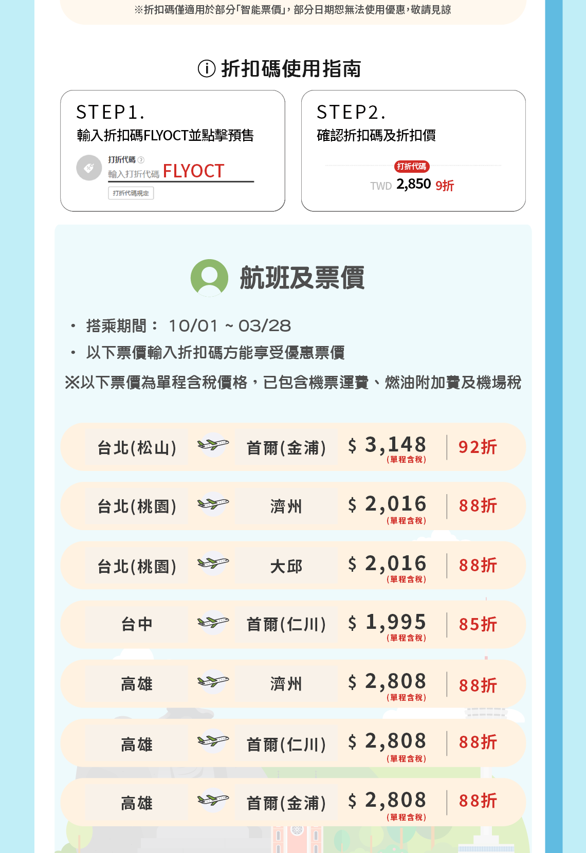 - 根據營業政策,各航線搭乘的期間中,可能會有不適用該特價票價的日期,敬請見諒。