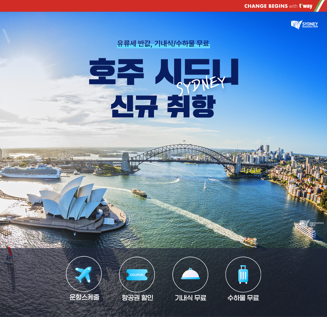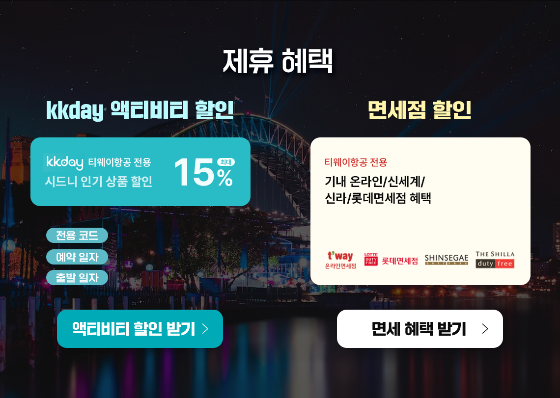 | 인천-시드니TW 501 | 월,수,금,토 | 22:20 | 10:45+1 |
