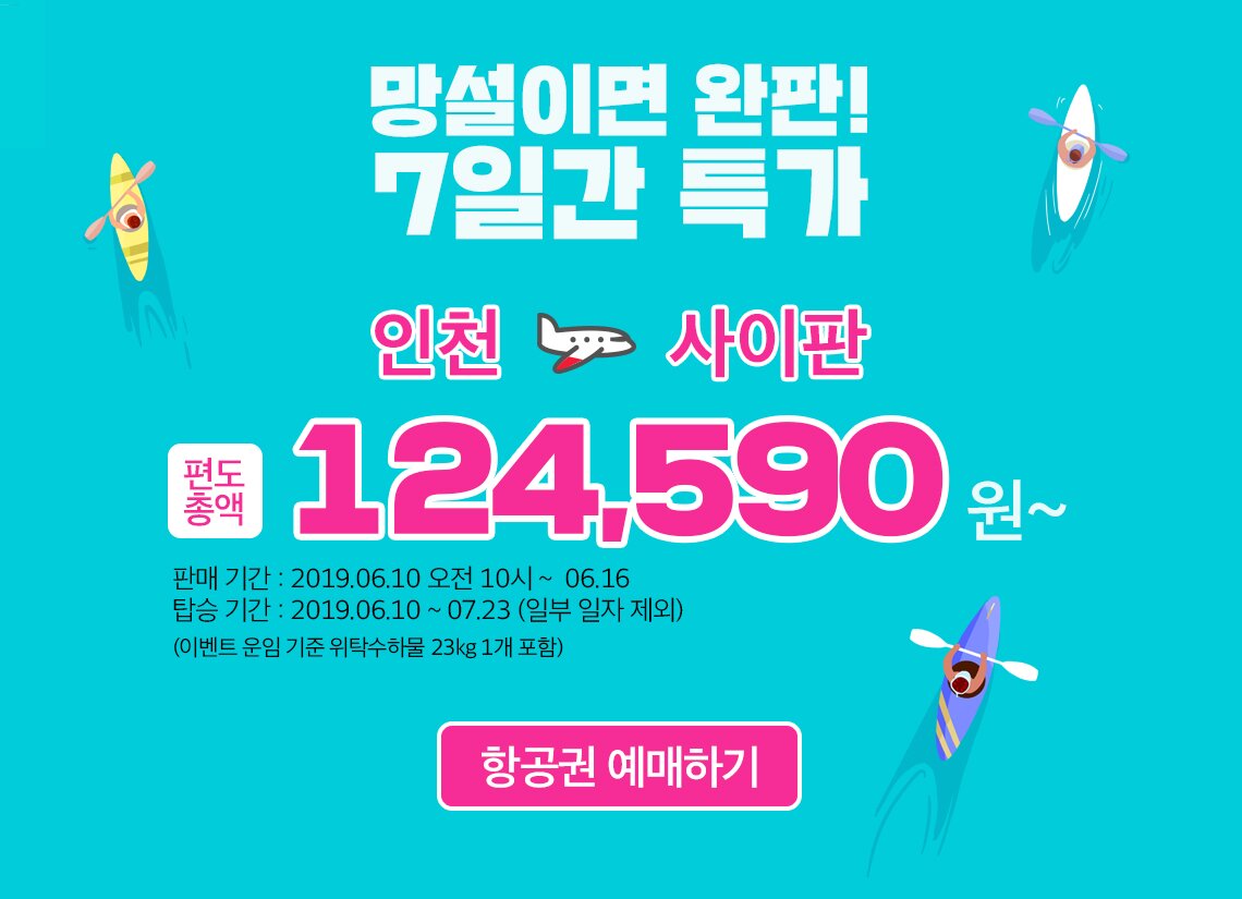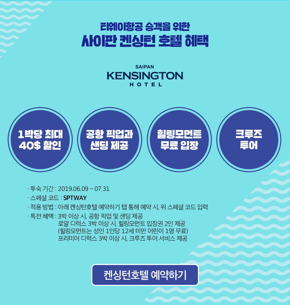사이판 호캉스 특가전 이벤트가 진행됩니다. 인천-사이판 노선 편도총액 124,590원입니다. 판매기간은 2019년 6월 10일 오전 10시부터 2019년 6월 16일까지, 탑승기간은 2019년 6월 10일부터 2019년 7월 23일로 일부 일자 제외됩니다. 이벤트 운임 기준 위탁수하물 23kg 1개 포함됩니다. 티웨이항공 승객을 위한 사이판 켄싱턴 호텔 혜택이 제공됩니다. 투숙 기간은 2019년 6월 9일부터 2019년 7월 31일까지입니다. 켄싱턴호텔 예약하기 탭 통해 예약 시, 스페셜 코드 SPTWAY를 입력하면 적용됩니다. 호텔 혜택은 1박당 최대 40달러 할인, 3박 이상시 공항 픽업 및 샌딩 제공, 로얄 디럭스 3박 이상 시 힐링모먼트 입장권 2인 제공됩니다. 힐링모먼트는 성인 1인당 12세 미만 어린이 1명 무료입니다. 프리미어 디럭스 3박 이상 시 크루즈 투어 서비스가 제공됩니다.