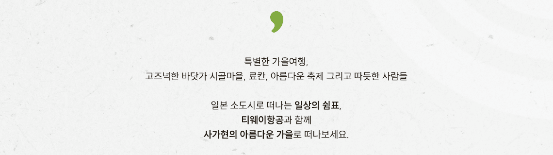 특별한 가을여행, 고즈넉한 바닷가 시골마을 료칸, 아름다운 축제 그리고 따듯한 사람들, 일본 소도시로 떠나는 일상의 쉼표, 디웨이항공과 함께 사가현의 아름다운 가을로 떠나보세요.POINT 01. 사가 곳곳에 분포한 다양한 즐길거리를 최적의 동선으로 경험하세요.