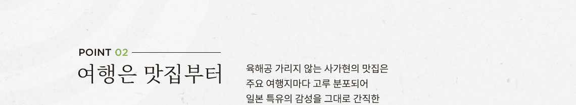 POINT 02. "여행은 맛집부터" 육해공 가리지 않은 사가현의 맛집은 주요 여행지마다 고루 분포되어 일본 특유의 감성을 그대로 간직한 다양한 맛과 분위기를 즐길 수 있습니다.