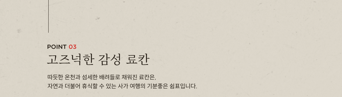POINT 03. "고즈넉한 감성 료칸" 따듯한 온천과 섬세한 배려들로 채워진 료칸은, 자연과 더불어 휴식할 수 있는 사가 여행의 기분 좋은 쉼표 입니다.