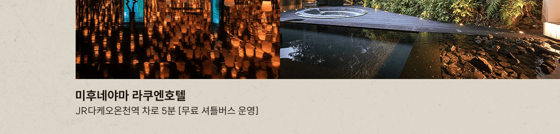 - 미후네야마 라쿠엔호텔 : JR다케오온천역 차로 5분 [무료 셔틀버스 운영]