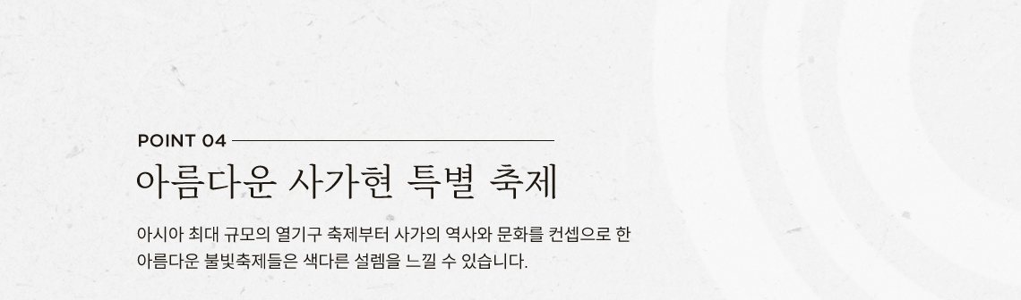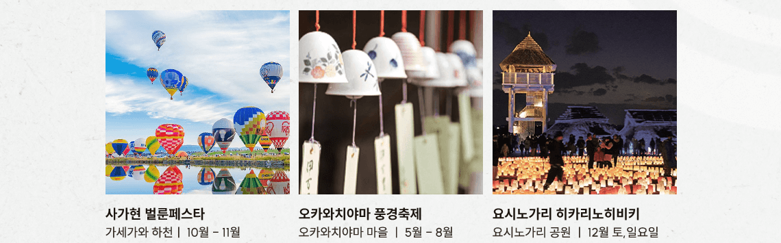 POINT 04. "아름다운 사가현 특별 축제" 아시아 최대 규모의 열기구 축제부터 사가의 역사와 문화를 컨셉으로 한 아름다운 불빛축제들은 색다른 설렘을 느낄 수 있습니다.