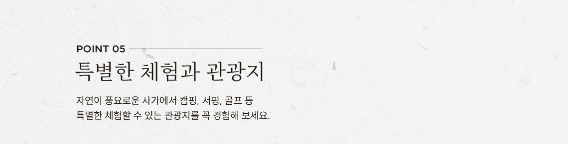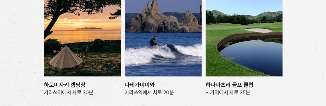 POINT 05. "특별한 체험과 관광지" 자연이 풍요로운 사가에서 캠핑, 서핑, 골프 등 특별한 체험할 수 있는 관광지를 꼭 경험해 보세요.