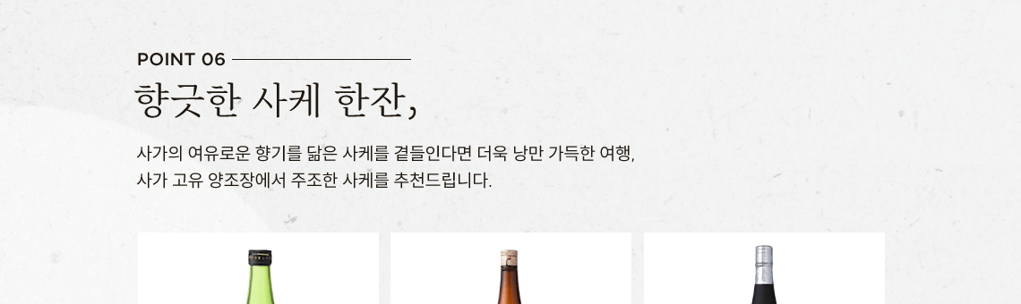 POINT 06. "향긋한 사케 한잔" 사가의 여유로운 향기를 닮은 사케를 곁들인다면 더욱 낭만 가득한 여행, 사가 고유 양조장에서 주조한 사케를 추천드립니다.